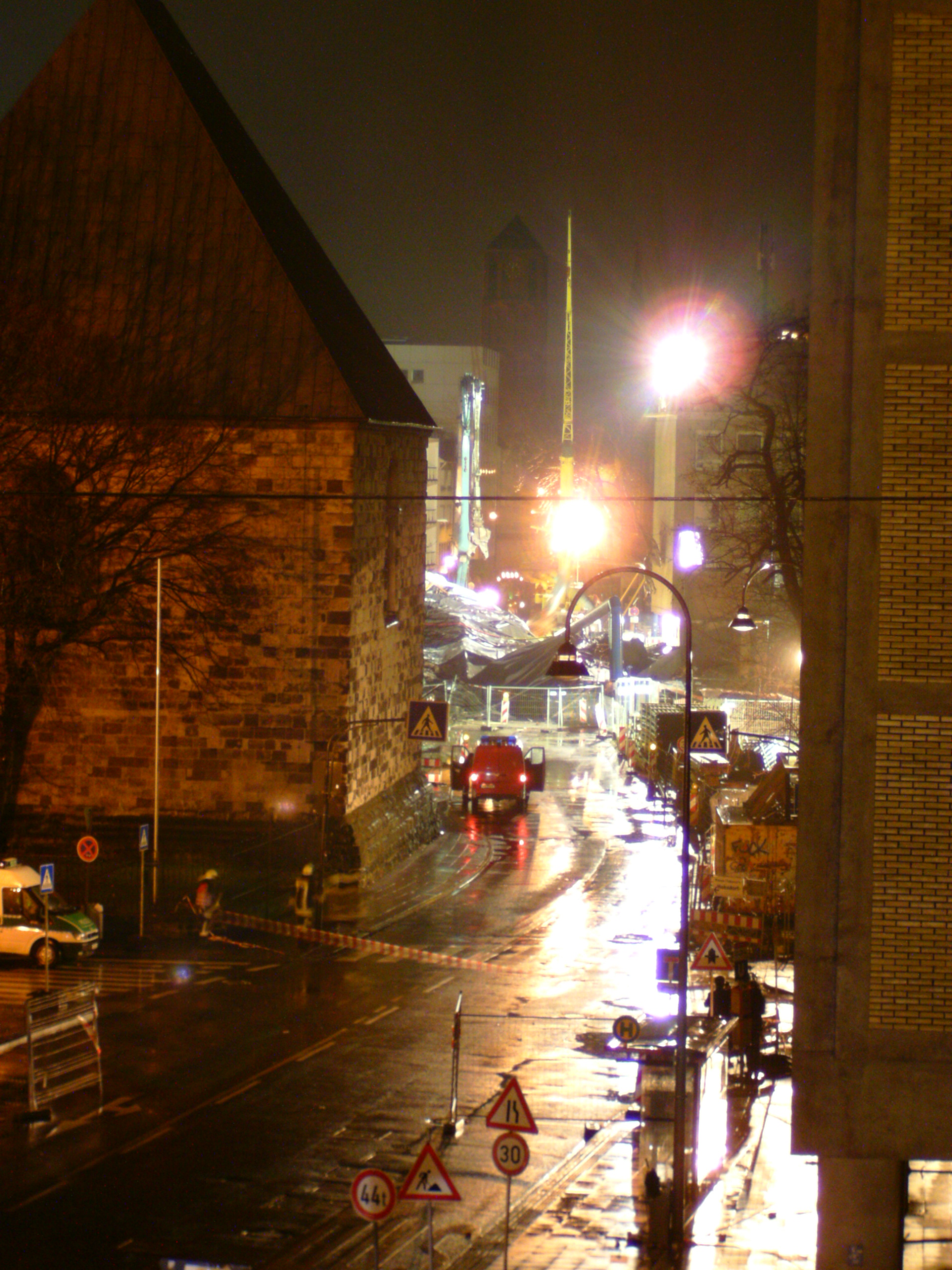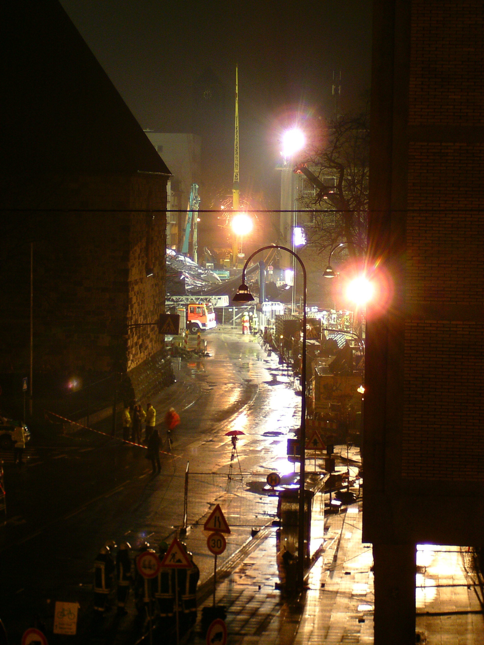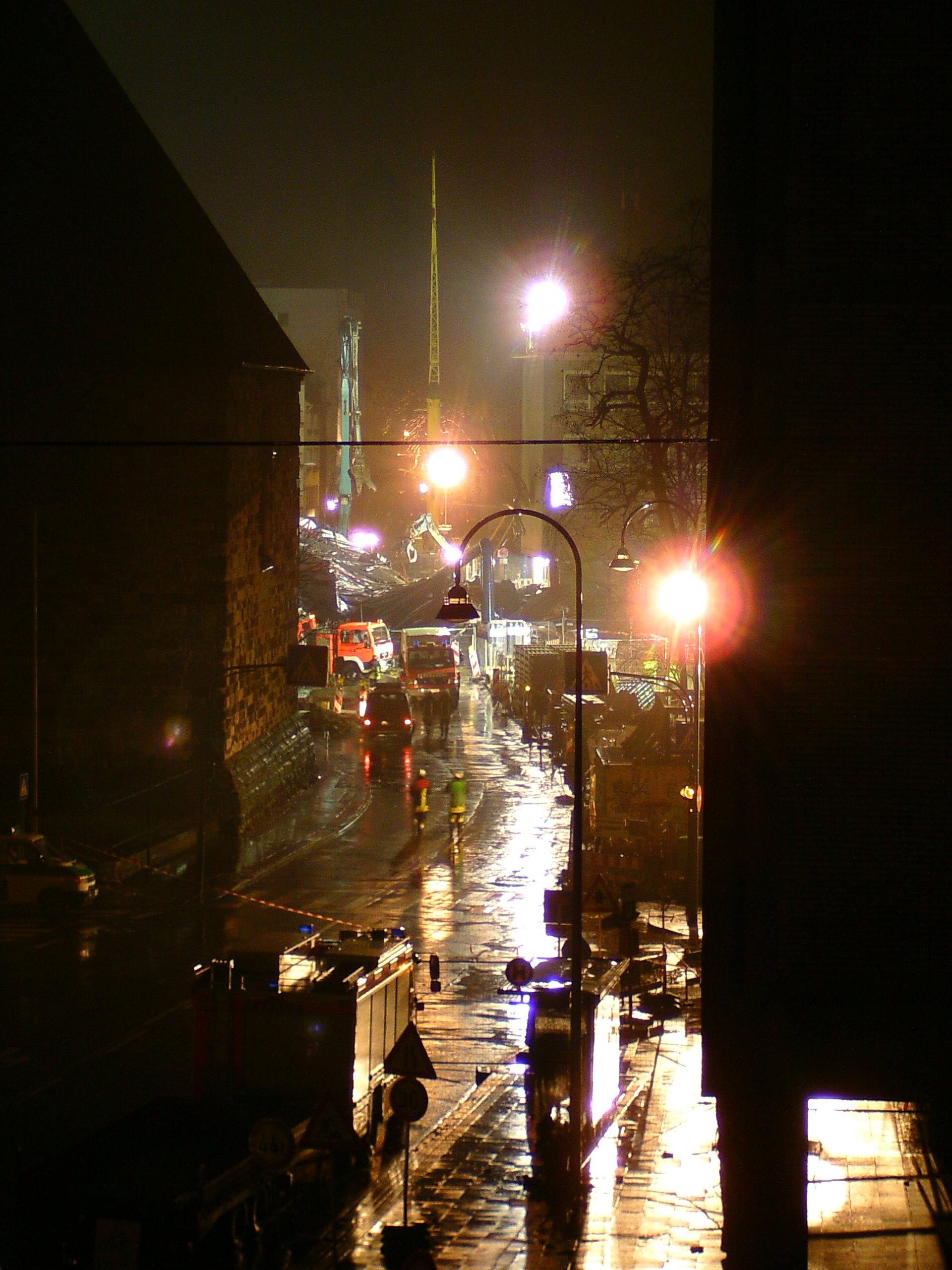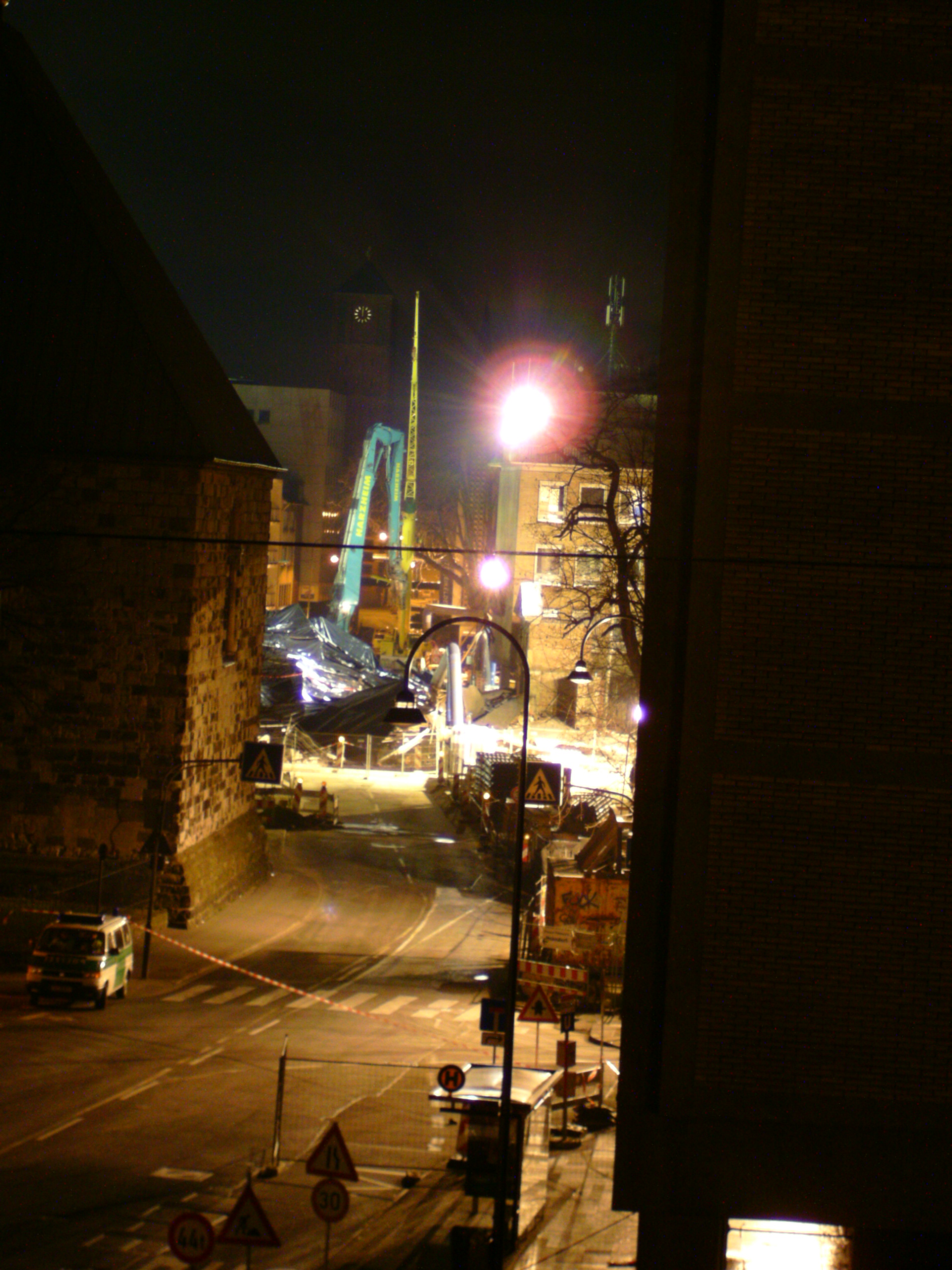 4:00 Uhr - Der blaue Bagger betätigt sich fleissig, wohl an den halb eingestürzten Nachbarhäusern |